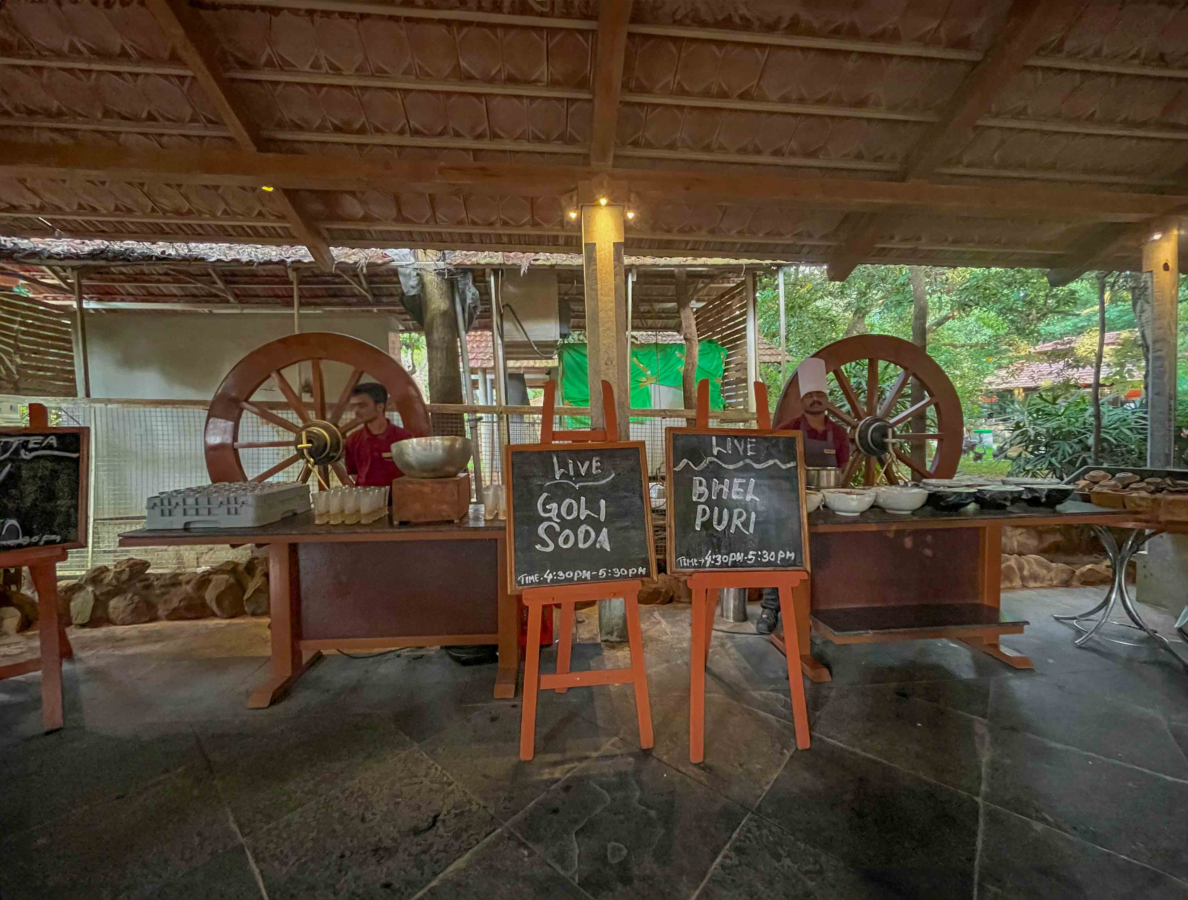 A highlight of our experience was the variety of food stalls offering delicious options like pizza, pani puri, and chaat. The overall ambiance was enhanced by the picturesque setting – the resort is beautifully situated amidst a water body and tall trees, creating a close-to-nature experience.